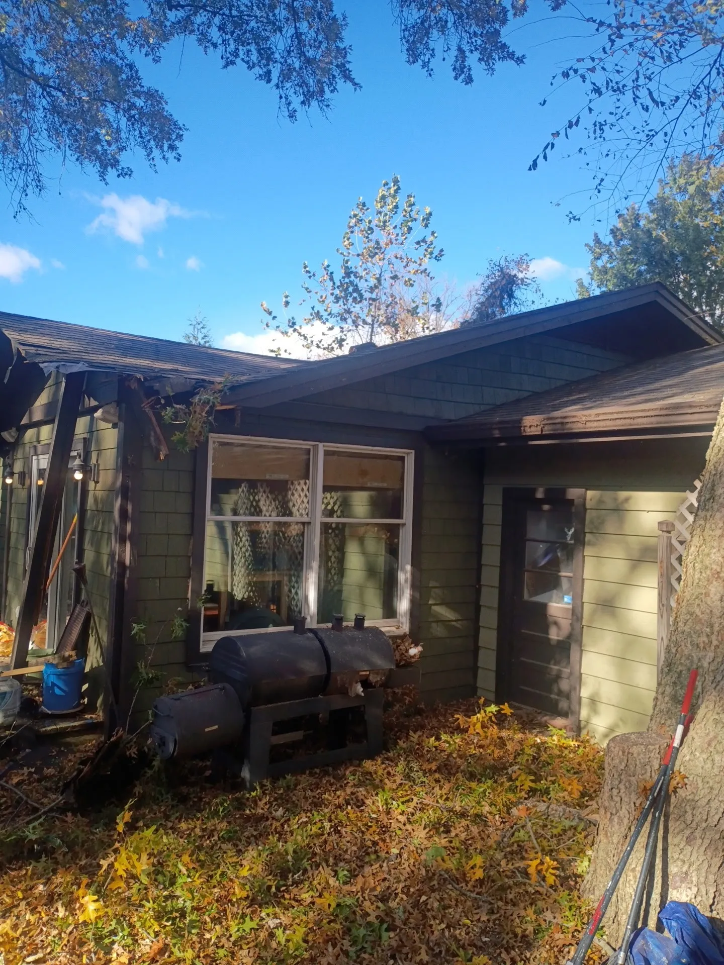 A tree service truck parked on a leaf-strewn driveway, with a tall tree and nearby residential buildings in the background